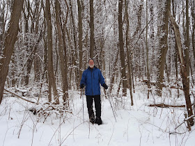 Yesterday was a good day, though Evie was busy with preparations for our dinner with the McClures last night. Before we went snow shoeing over at Long Point, she made a banana cream pie for dessert, Ron's favorite. Around 11:30, we drove to the end of Lakeside Drive, Evie strapped on her snow shoes, and we were off in the winter wonderland of the park. The woods were still frosted from the previous day's snow, and we walked for an hour. Both of us were tired by the end of hour walk, just wanting to get back to the car and home.