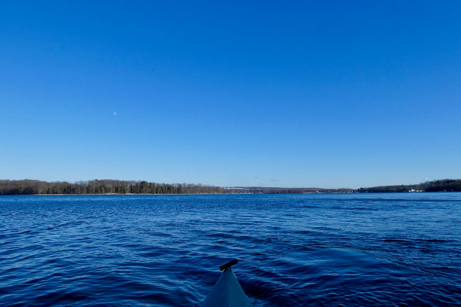 After lunch, I kept to routine, reading and napping for a bit, not a very satisfactory one actually. I then did some reading on my computer, catching up on the news on the NYTimes and Washington Post, mostly depressing, with fears of a rising conflict with Iran and the fires in Australia. Strangely, the sun came out around 2:00, the skies turned blue and I could not resist the temptation to get out there on the lake, It was in the high 30's so I was not cold except when the wind picked up, I paddled north, down to Magnolia, hugging the shoreline, past the campground, blinded at times by the sun beginning to drop below the treeline. It felt good to be out there, enjoying the sun.