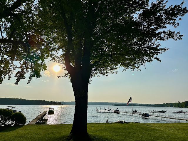 After lunch, I opened the windows in the bedroom and napped and read under a nice breeze, just like last summer. Around 3:00, I had a great talk with our daughter Beth, who just finished her first year teaching in Dallas after a long hiatus to raise a family. She, of course, received top evaluations. At 5:00, Evie had a Zoom call with her sisters, and I went outside and began the process of anchoring buoys in front of our dock to keep boats from infringing on our swimming area. I put in three and have four more to put in when the wind calms down.